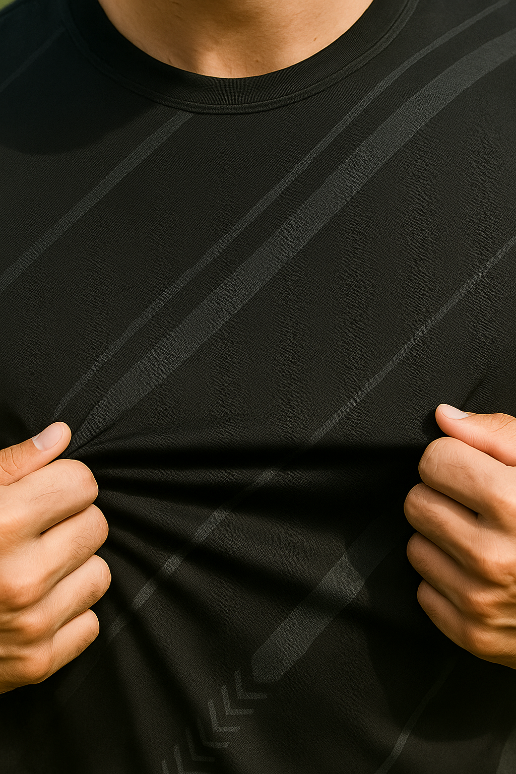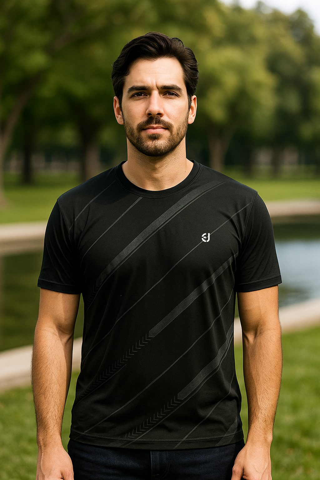 Unleash your edge with the VelocityStrike™ Performance Tee in Midnight Black — engineered for movement, built for impact. With angular reflective stripes woven into the design, this tee exudes energy and power while keeping you cool during intense sessions or sharp urban outings.